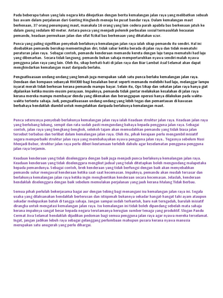 Sementara menunggu ketibaan pasukan penyelamat aku dan beberapa orang pengguna jalan raya yang lain turut membantu mengeluarkan mangsa kemalangan yang tersepit di dalam keretanya. Panjangnya rumusan hendaklah tidak melebihi 120 patah perkataan. Statistik Keselamatan Jalan Raya Jabatan Keselamatan Jalan Raya Malaysia 2018 menyatakan faktor-faktor yang menyumbang kepada kemalangan jalan raya di Malaysia adalah 806 disebabkan kelalaian manusia 132 berpunca dari keadaan atau kondisi jalan raya manakala kenderaan hanya menyumbang 62 peratus daripada kemalangan yang berlaku.