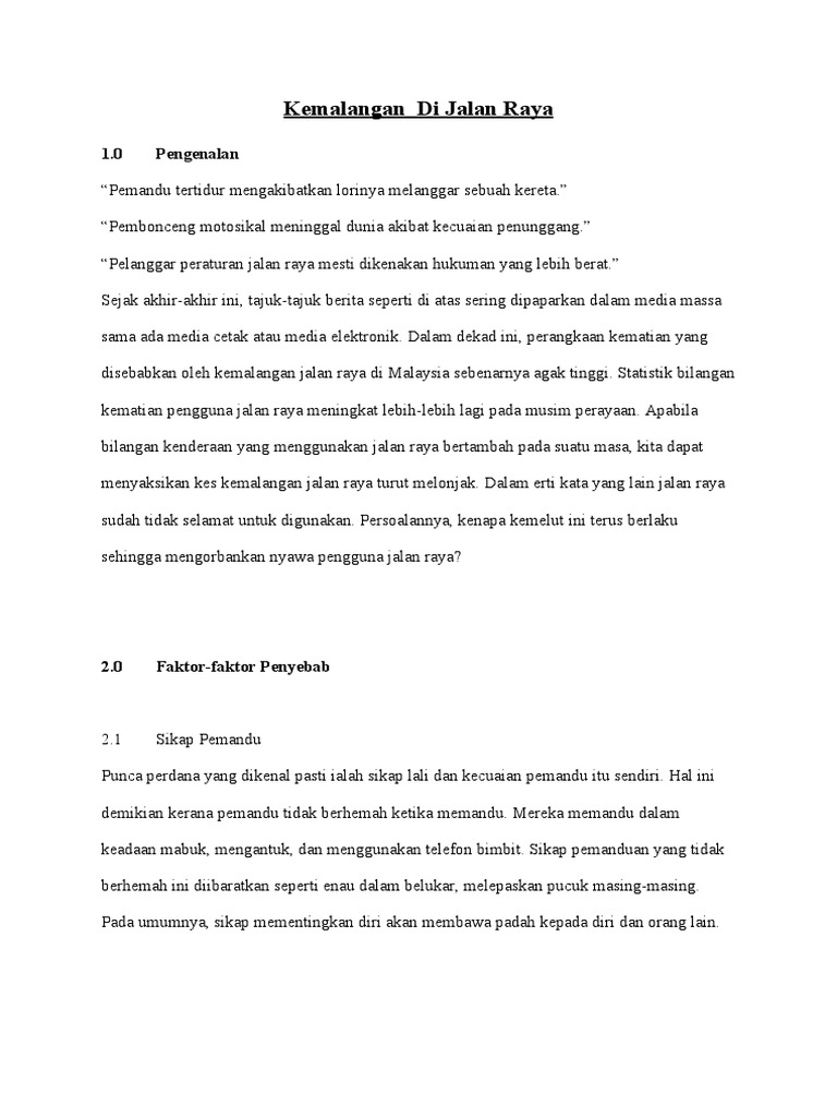 100 markah PENDAHULUAN Jalan raya dibina oleh kerajaan bertujuan memudahkan perjalanan dan kemudahan pengangkutan bergerak kemalangan semakin meningkat saya harus memainkan peranan untuk mengurangkan kemalangan di jalan raya ISI. 24022011 Kemalangan jalan raya yang kerap berlaku sejak belakangan ini adalah berpunca daripada sikap pemandu yang suka memandu melebihi had laju yang ditetapkan. Pada pendapat saya kerajaan memainkan peranan penting dalam usaha penyelesaian ini.