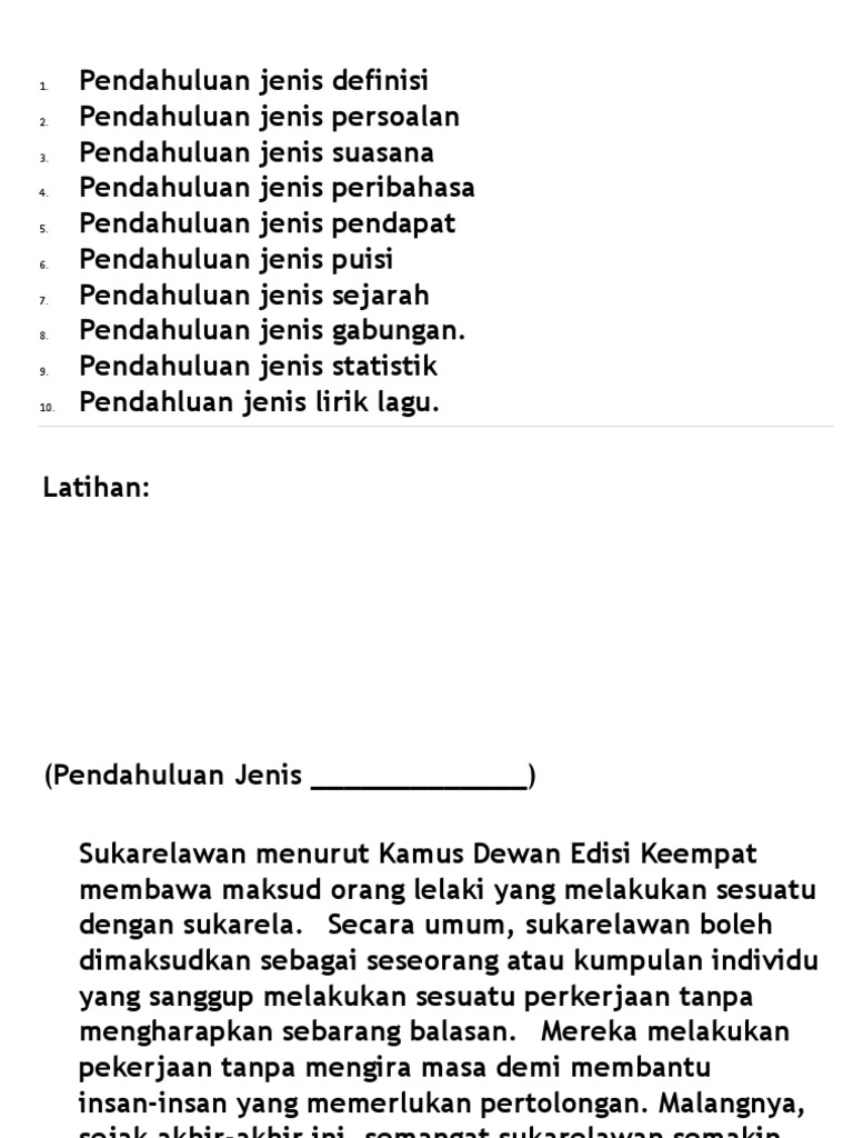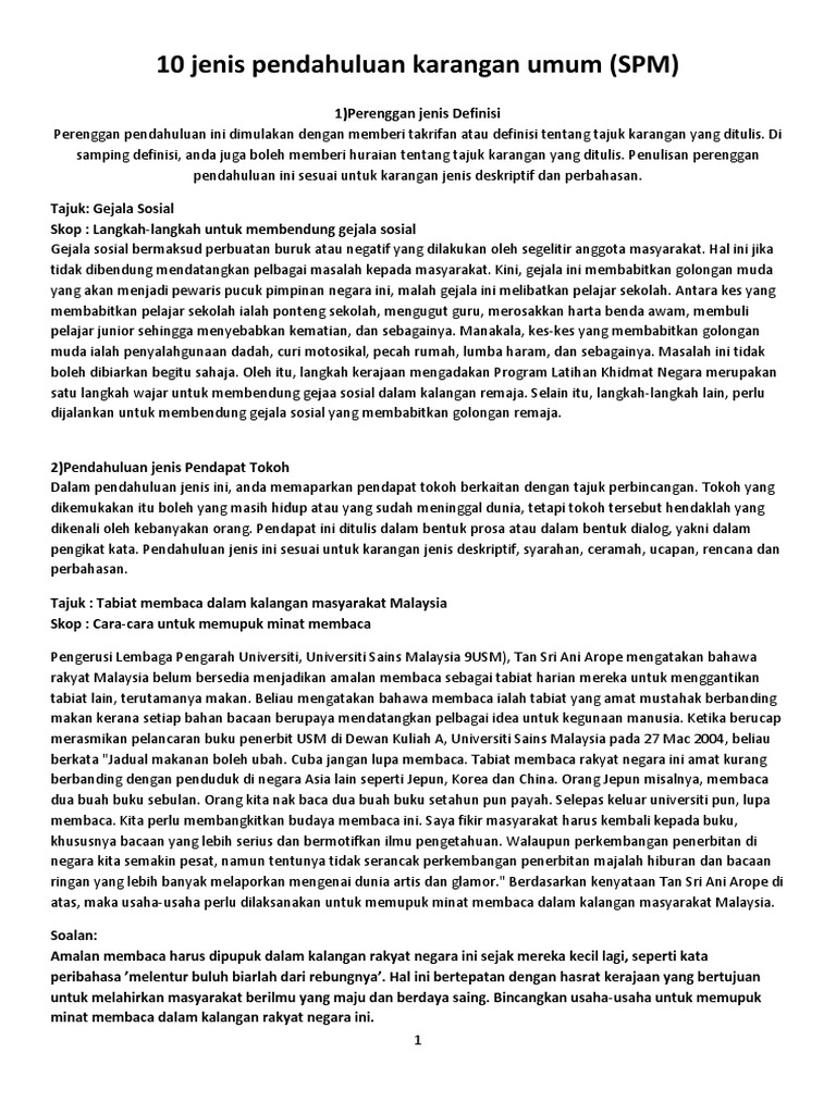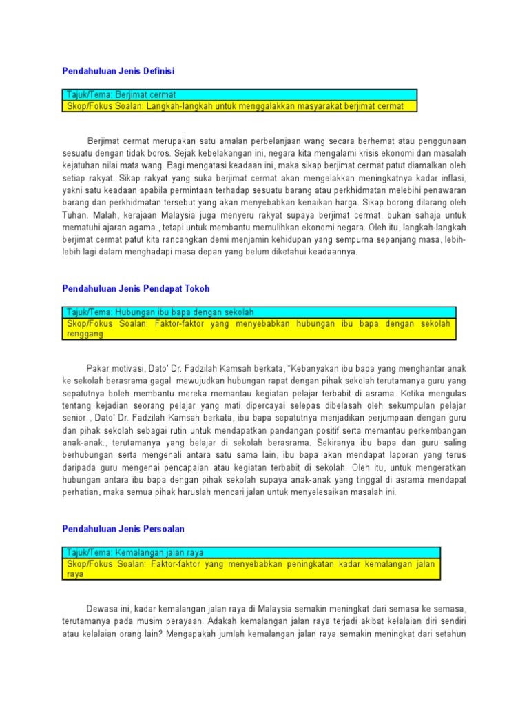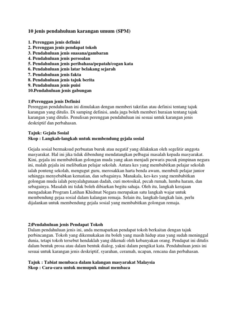 27022020 Berikut dikongsikan jenis-jenis pendahuluan dalam penulisan karangan Bahasa Melayu sebagai panduan semua. Selain itu pendahuluan dapat menunjukkan arah kepada pembaca tentang persoalan yang akan disentuh dalam isi karangan. Pada pendapat anda apakah langkah-langkah yang perlu diambil untuk mengatasi kes kemalangan jalan.