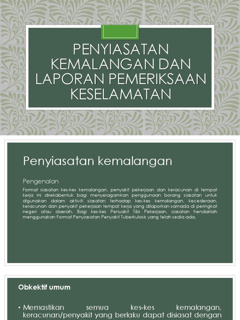 PERINCIAN KEMALANGAN Terangkan supaya orang yang tidak mengetahui operasi atau aktiviti kerja di tempat anda dapat faham. Sebarang insiden kejadian kemalangan atau penyakit pekerjaan yang berlaku di tempat kerja perlulah disiasat puncanya bagi mengenalpasti faktor penyebab utama kepada kejadian tersebut. 29112014 Meliputi kemalangan yang.